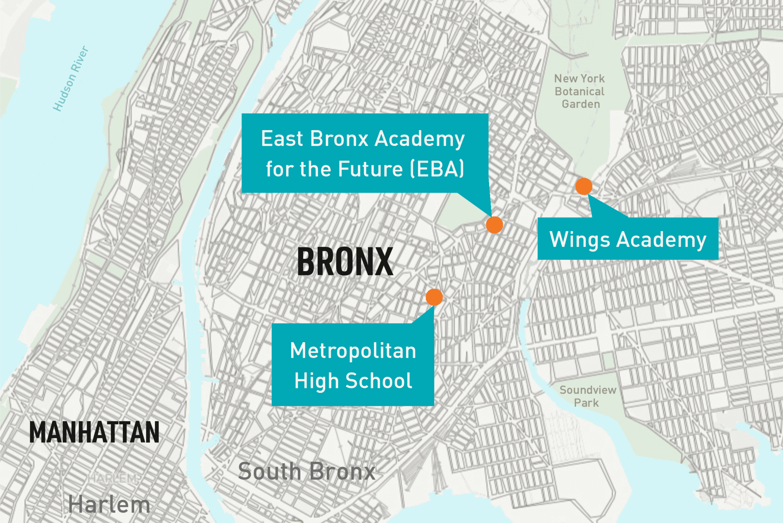 B2CC operates at our community school partners: East Bronx Academy for the Future, Metropolitan High School, and Wings Academy (MAP)