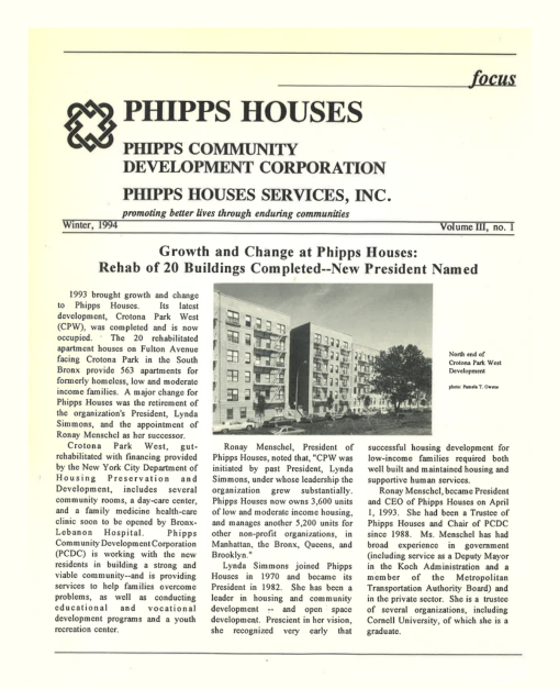 Phipps develops the 20-building Crotona Park West/Lynda Simmons Homes. Significant resident and community service programming is part of the development plan.
